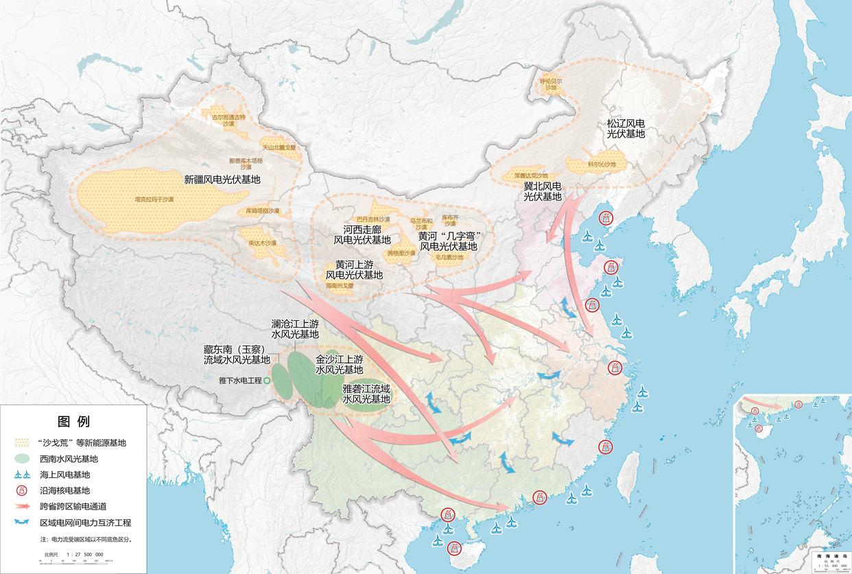 从示意图可以看到,辽阔北方的“沙戈荒”等新能源基地,雅砻江、金沙江上游、澜沧江上游等流域的水风光一体化基地,从渤海到南海的海上风电基地以及沿海核电基地,各地因地制宜,风光水核等多能并举,串点成线、从点到面,为加快构建清洁低碳安全高效的新型能源体系夯实基础。