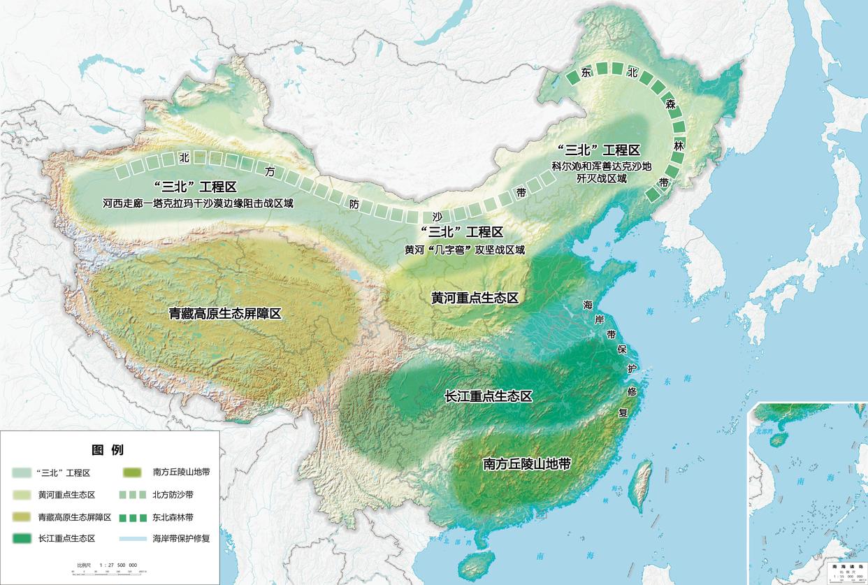 “四带”——东北森林带、北方防沙带、南方丘陵山地带、海岸带保护修复。